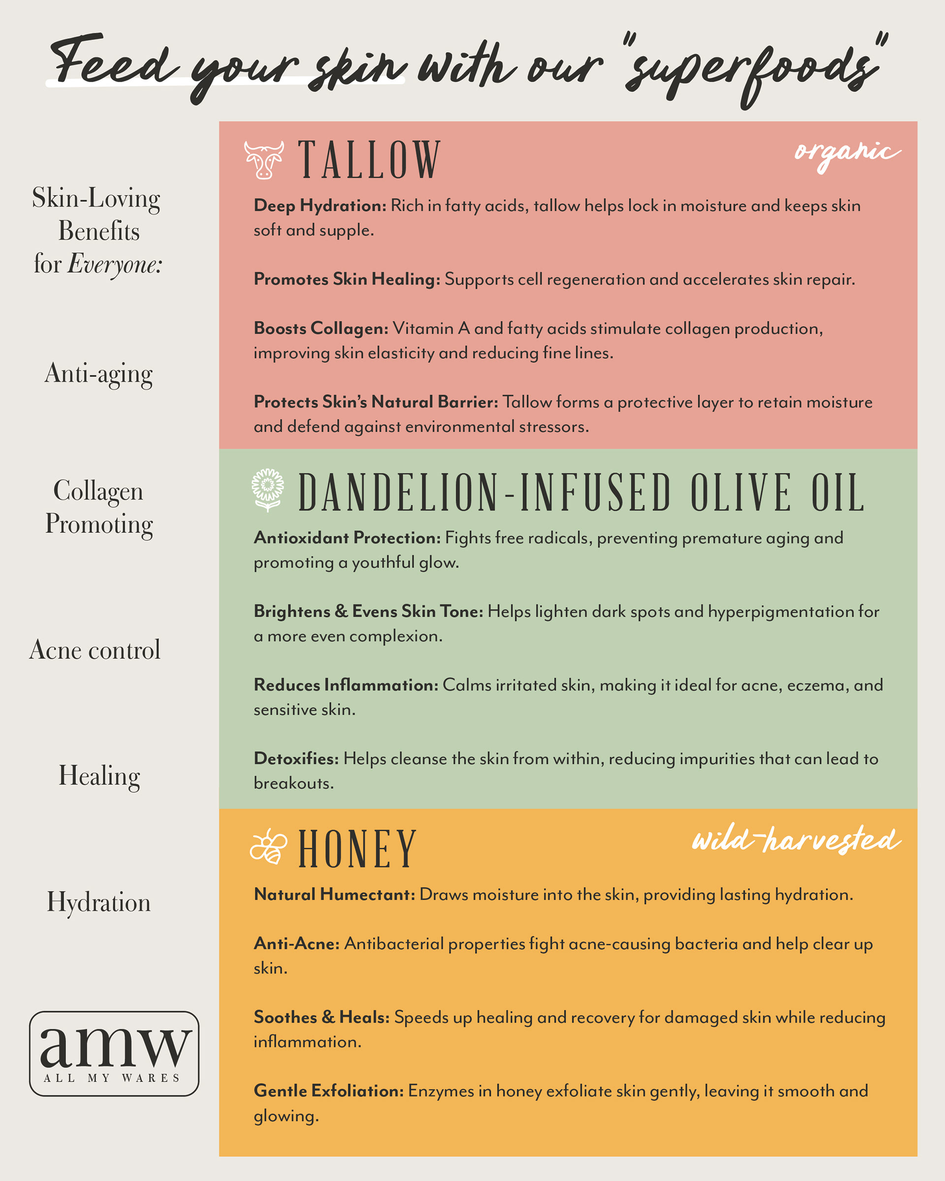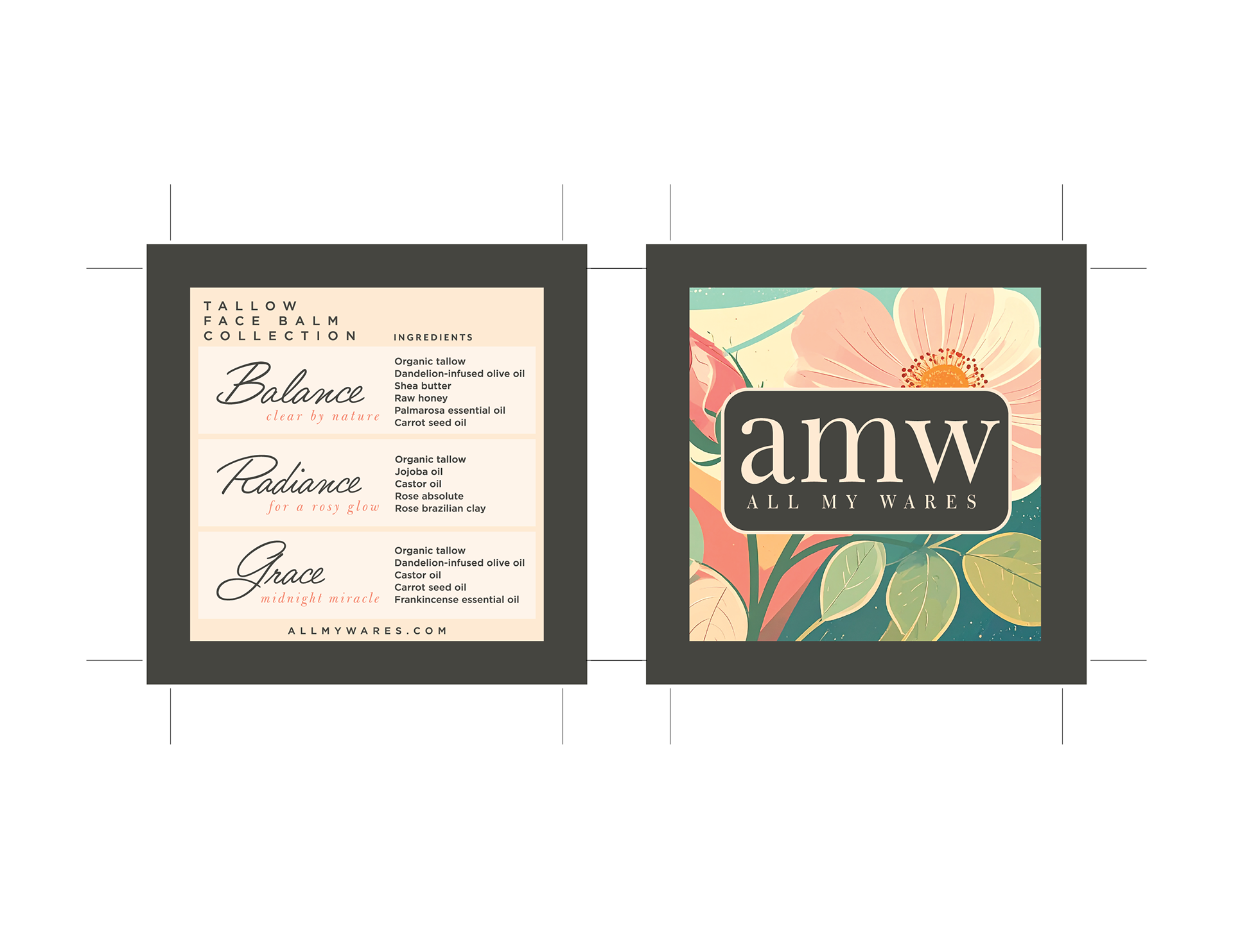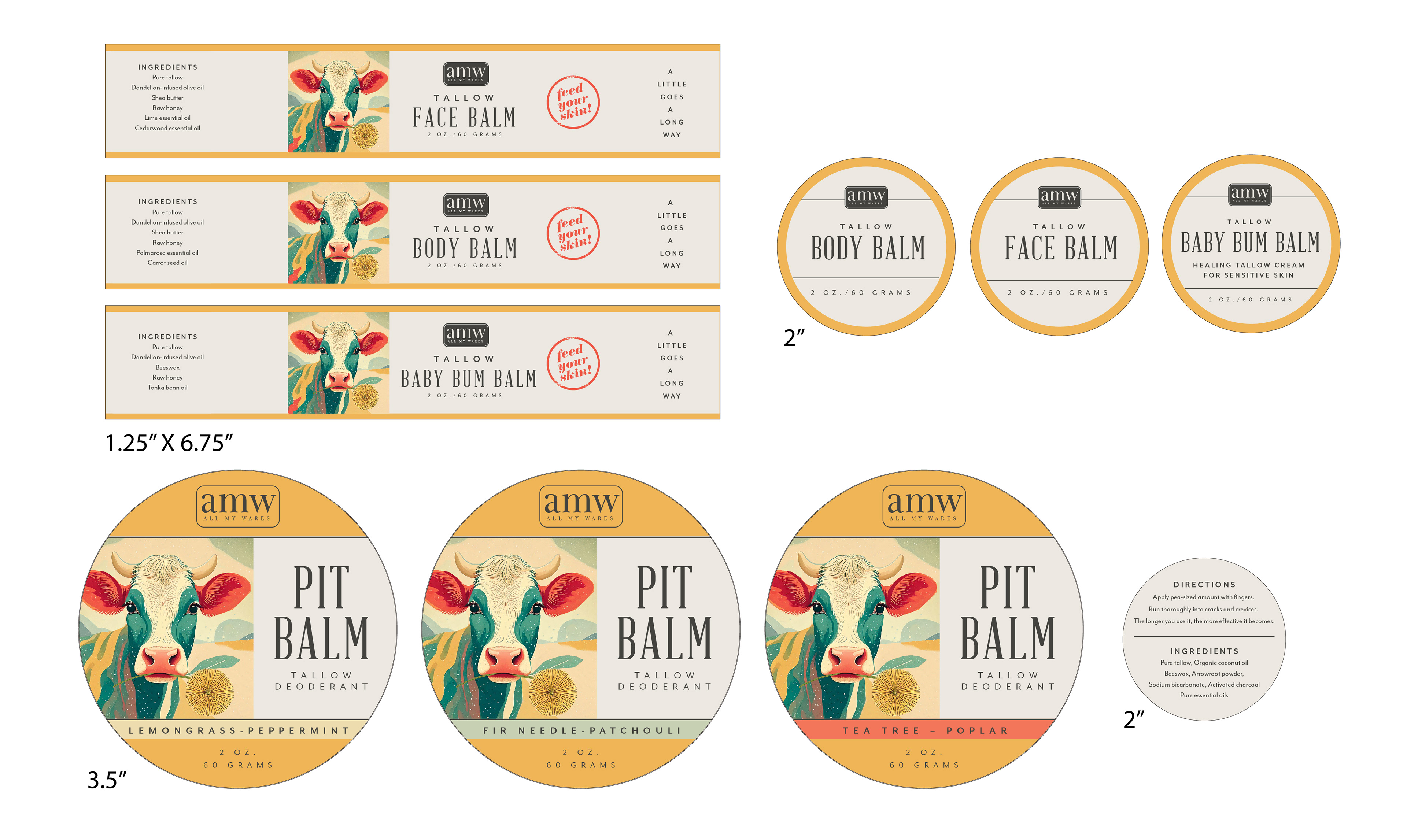 All My Wares is a natural skincare company that offers a full line of tallow-based products. In developing this brand and packaging, we recognized the need for the products to stand out in boutiques and markets where shoppers might not know quite what they're looking for. Hooked by the packaging's vibrant appeal, All My Wares customers quickly become loyal when they experience the product's quality and benefits.